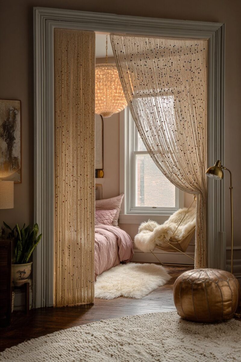 Hang beaded curtains not just in doorways but also as room dividers, creating separate zones within your space for different activities and moods.