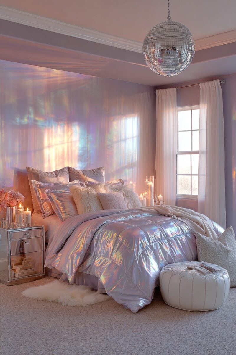 Step into the future with surfaces that shifted and shimmered like something straight out of a sci-fi movie, but make it bedroom decor.
