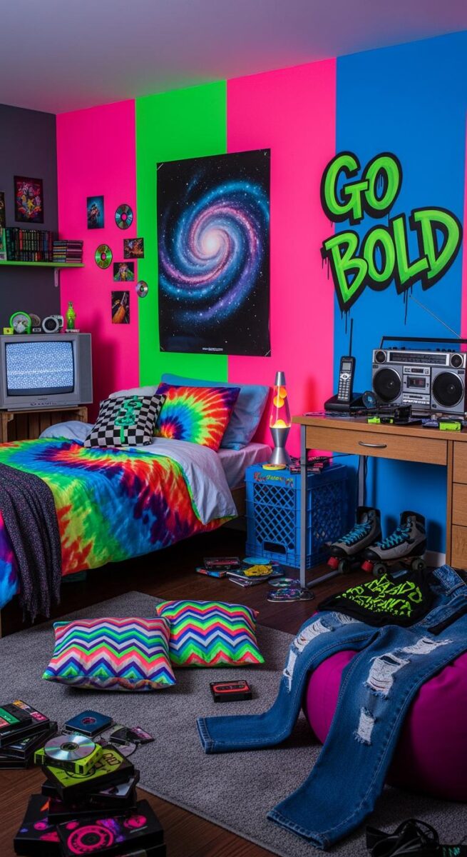 Neon lighting accents instantly transform rooms into retro masterpieces, and this is one of my favorite ways to add that 90s edge.