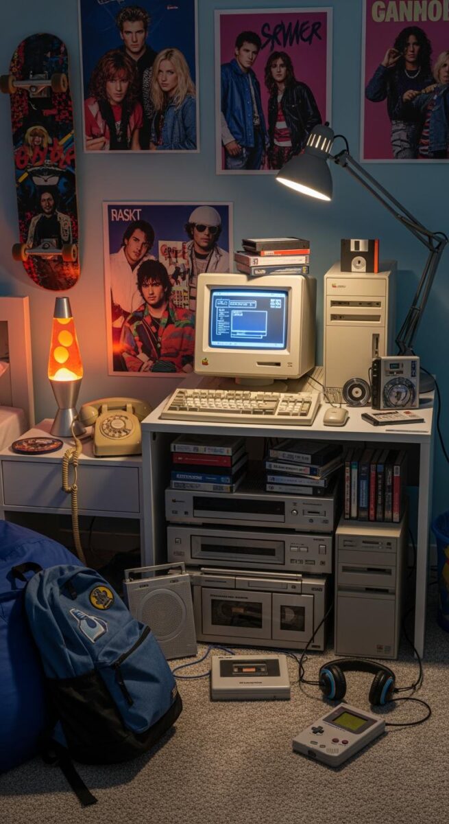Bulky CRT TVs, VCRs, and CD players with giant stereo systems were 90s bedroom must-haves, and I love incorporating vintage tech as decor now.