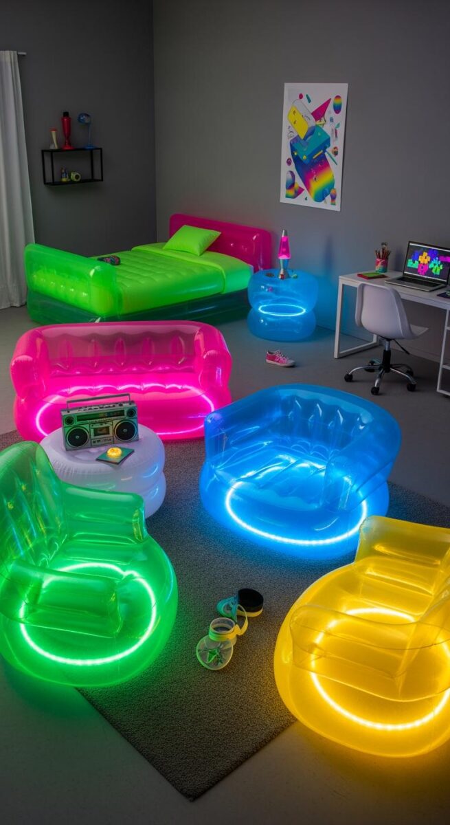 Bright inflatable chairs add an extra dose of nostalgia to 90s bedrooms, and I’ll be honest with you—they’re not super comfy for long periods, but they’re so fun.
