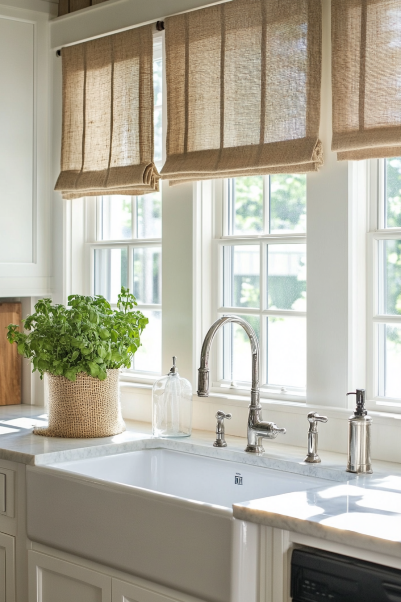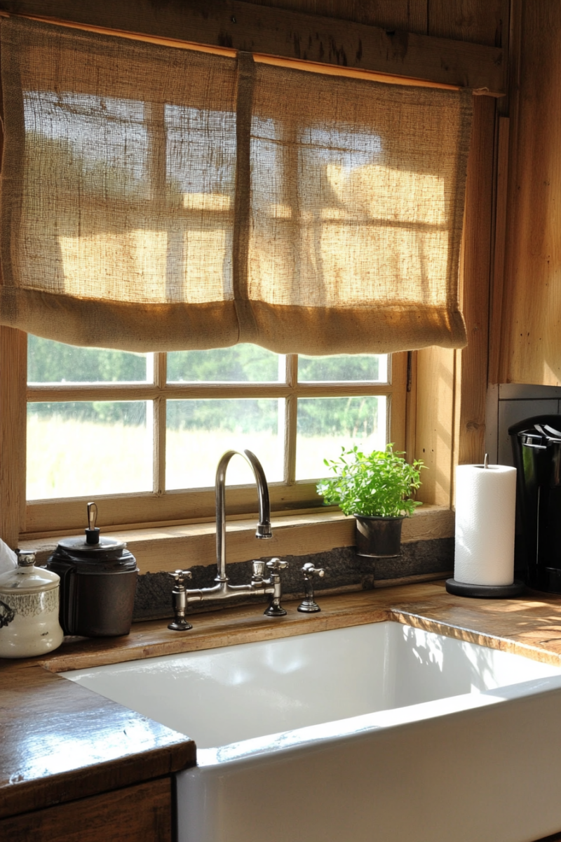 So, if you want to give your above-the-sink window a cozy, down-to-earth feel, burlap curtains are a no-brainer.