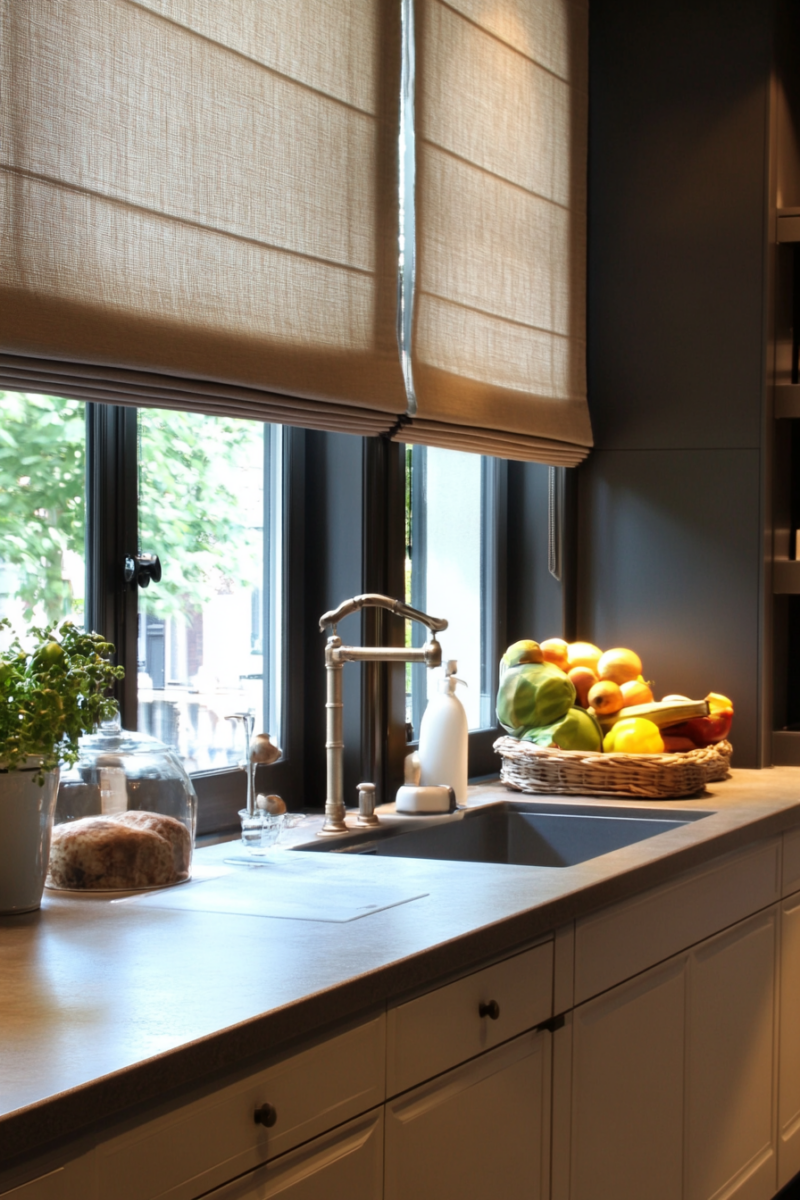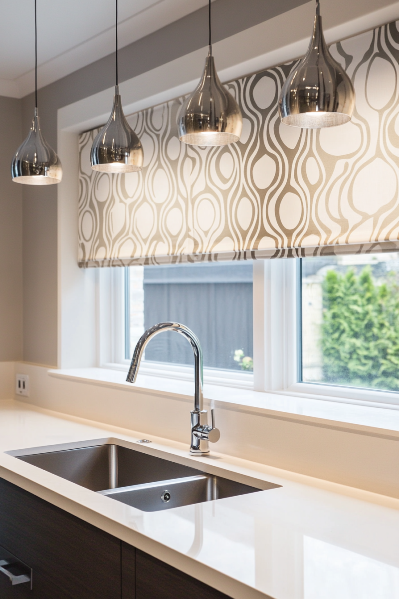 For kitchens with a modern or industrial vibe, roller shades in neutral tones or metallic finishes work beautifully.