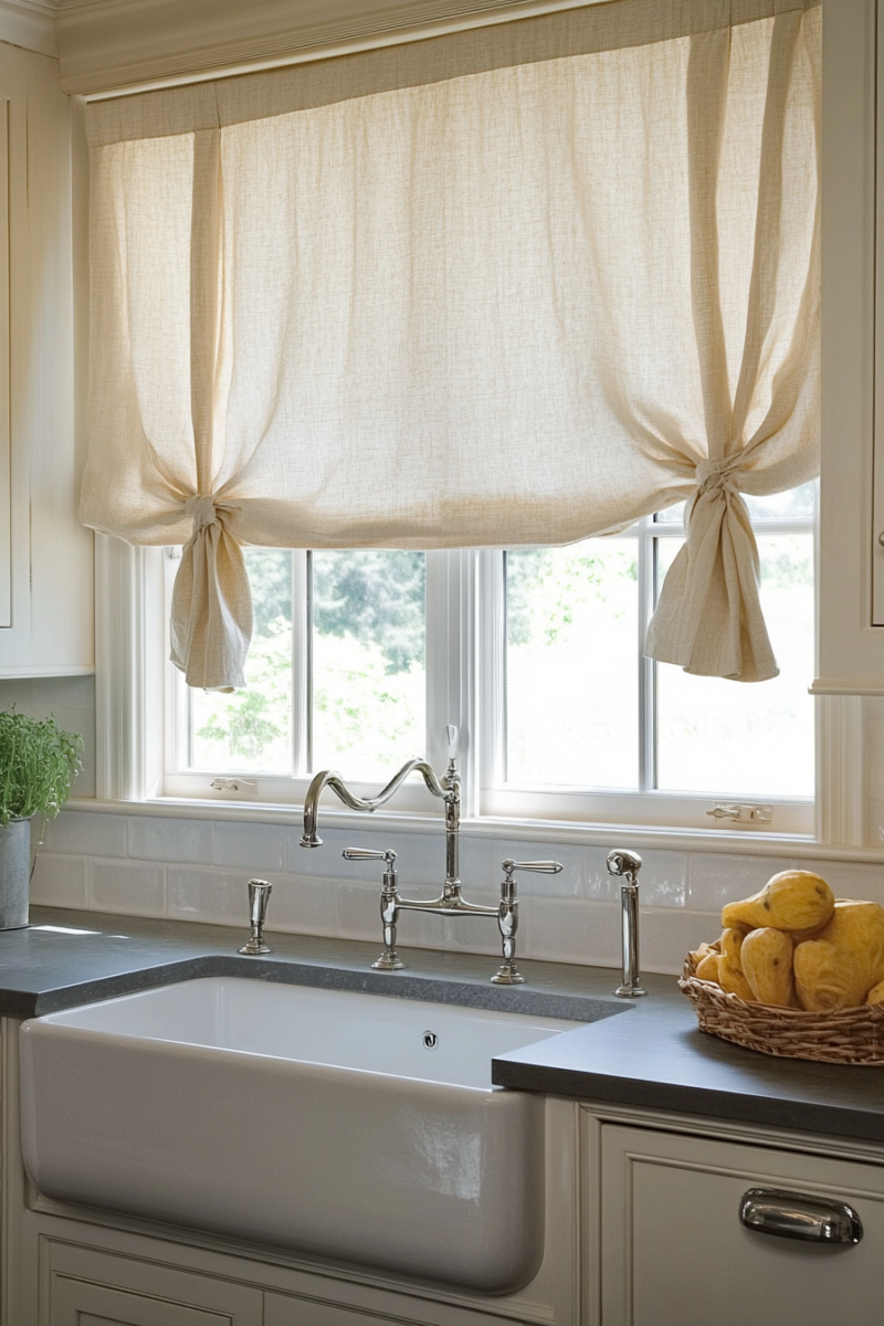 Tie-up curtains are a cute and casual option that brings a laid-back, lived-in feel to your kitchen.