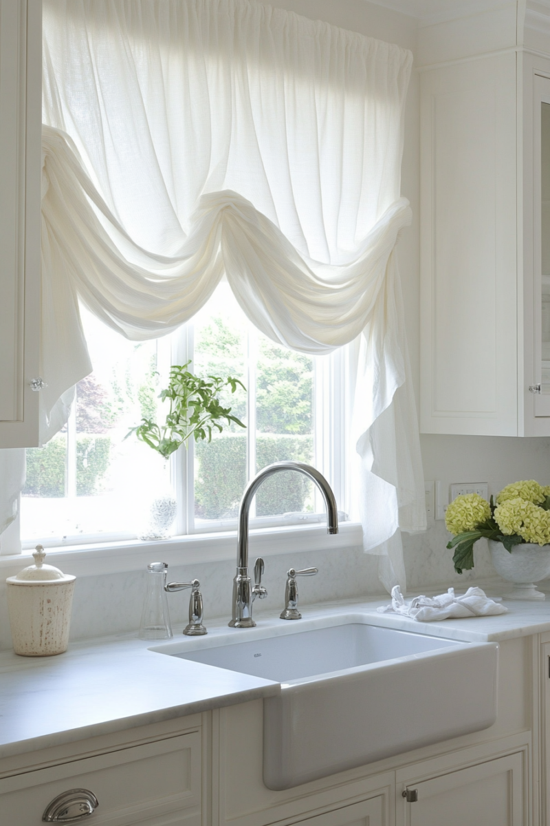 Sheer voile curtains blend seamlessly into modern, coastal, or even shabby-chic kitchen themes.