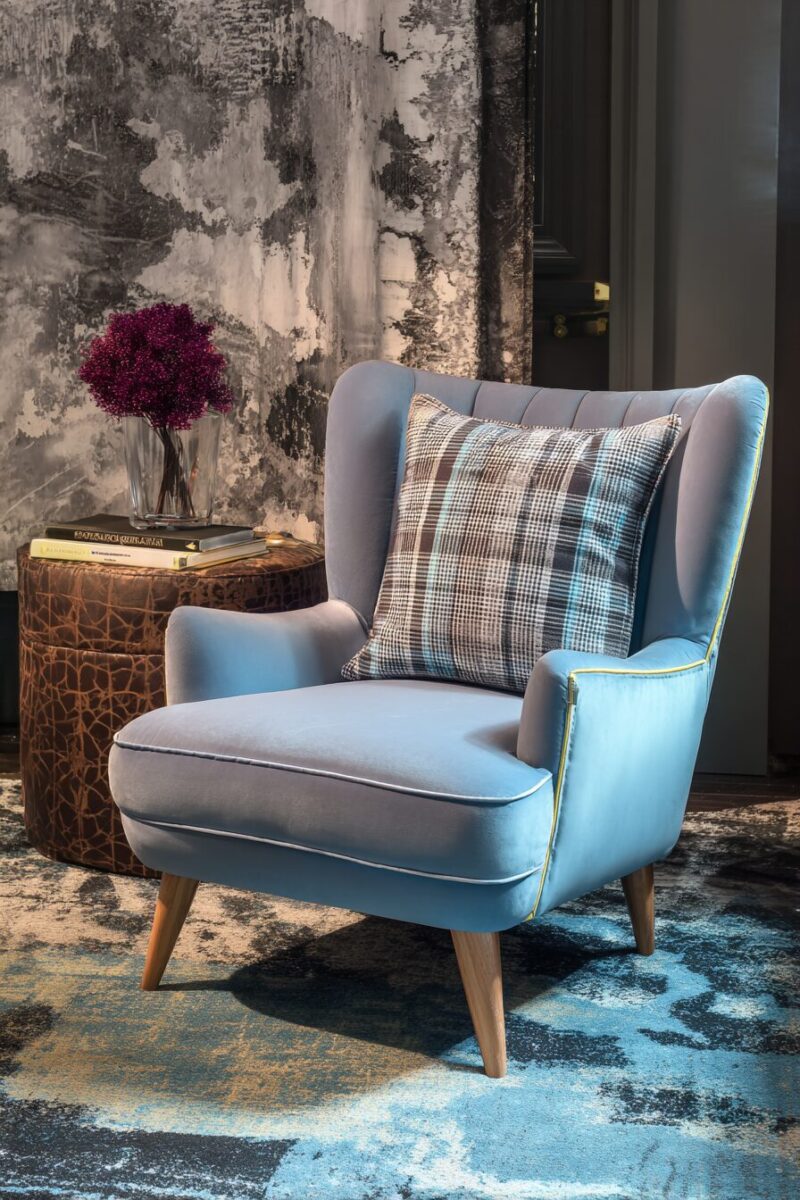 When using a high-impact accent chair, keep surrounding furniture visually quiet to prevent competition and visual clutter.