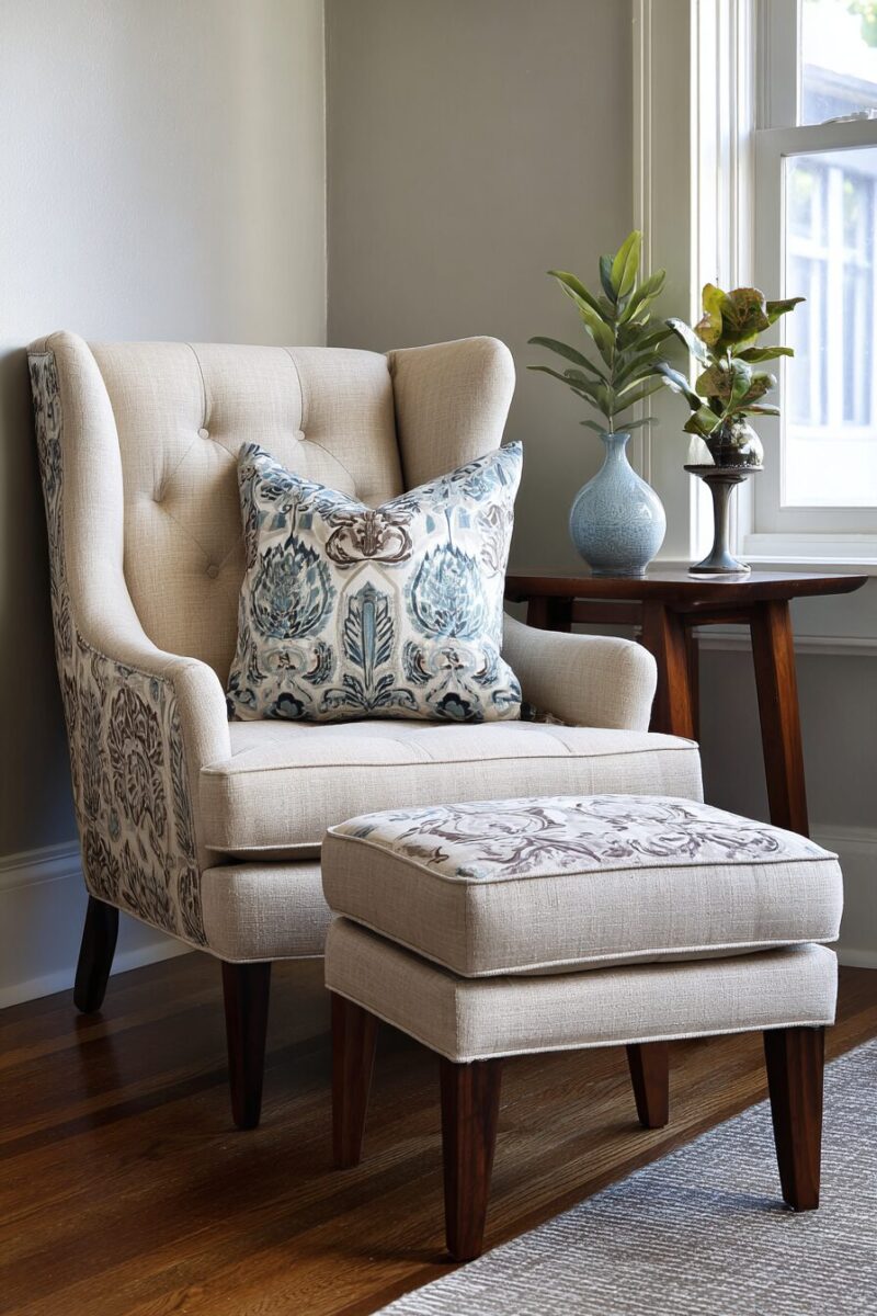 The ottoman’s upholstery presents an opportunity to introduce complementary texture or pattern that enhances your accent chair without overwhelming the space.