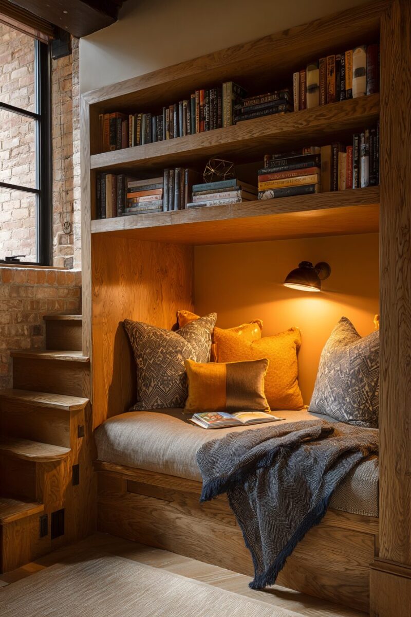 Built-in seating typically follows the width of the bed above, featuring thick, comfortable cushions that invite hours of reading, with storage compartments underneath for books, throws, and reading accessories.
