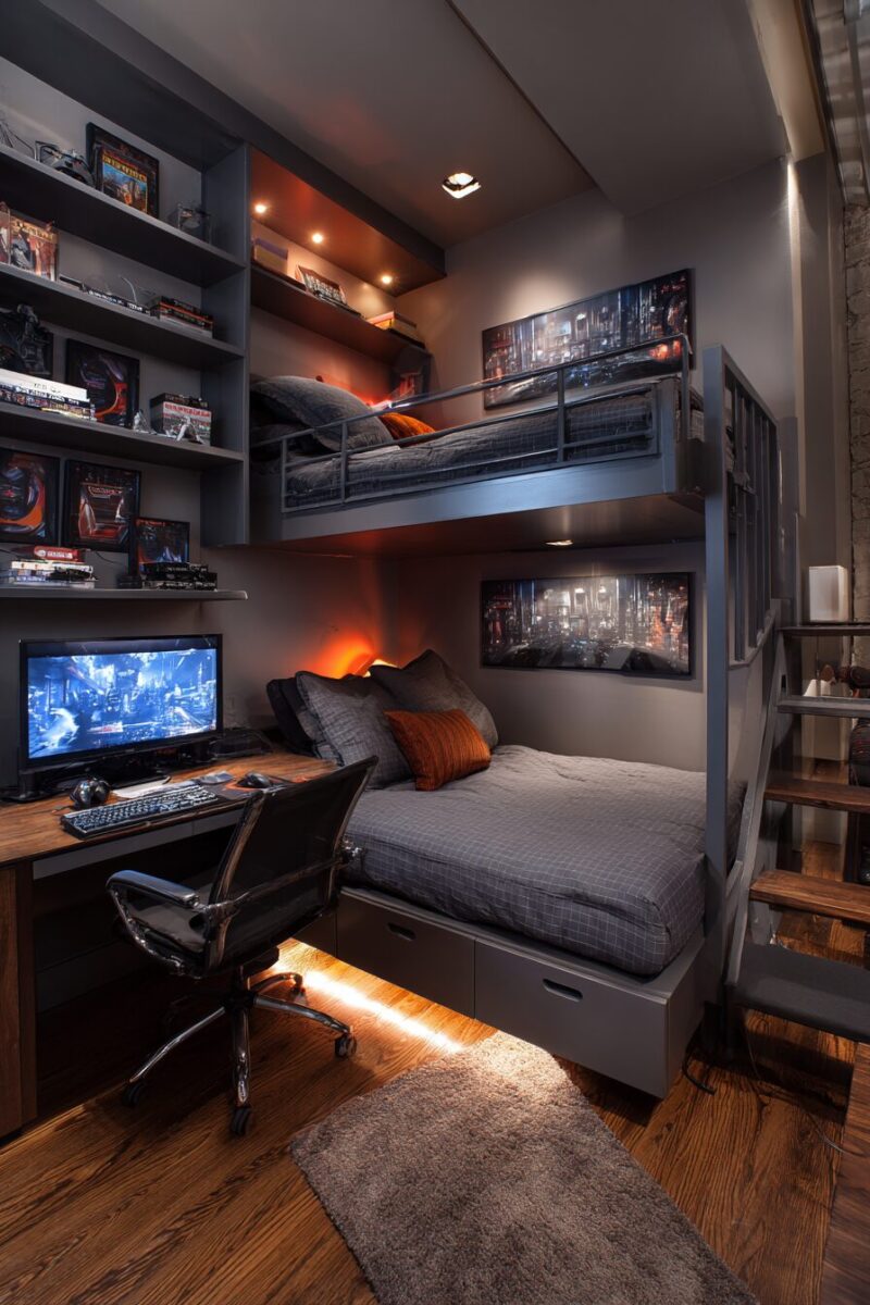 Combine sleeping space with the ultimate entertainment experience by integrating a full media center and gaming station into your bunk bed design.