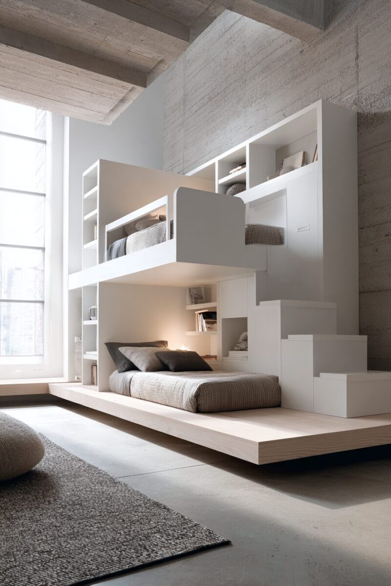 Embrace clean lines and architectural simplicity with a floating bunk bed design that appears to defy gravity while providing maximum visual space and modern aesthetics.