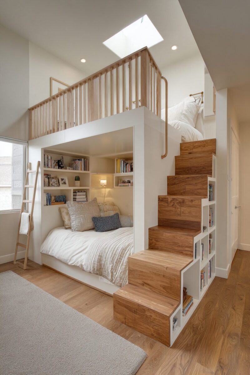 The design maximizes floor space in the room’s center while providing two full-size sleeping areas that feel separate and private rather than stacked directly on top of each other.