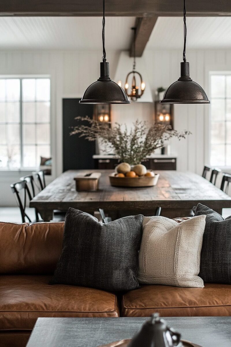 These statement pieces—from oversized warehouse pendants to sleek pipe sconces—introduce clean lines and mixed metals that prevent traditional farmhouse elements from feeling too precious or predictable.