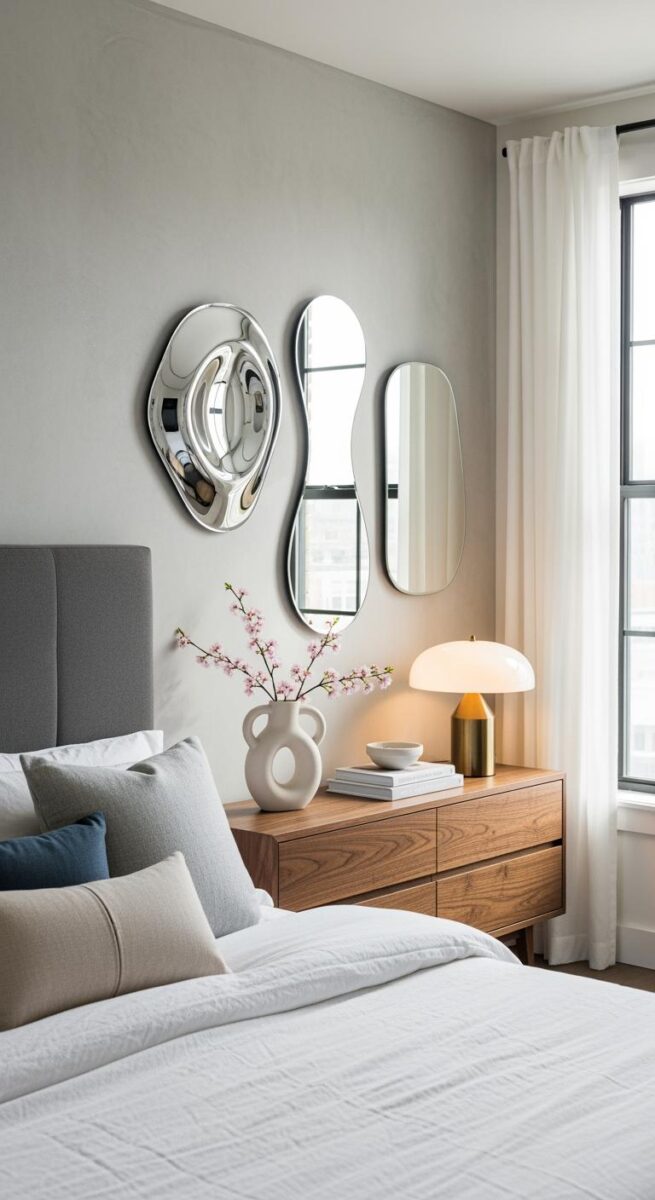 Think acrylic chairs, mirrored nightstands, or sleek white dressers with gold hardware.