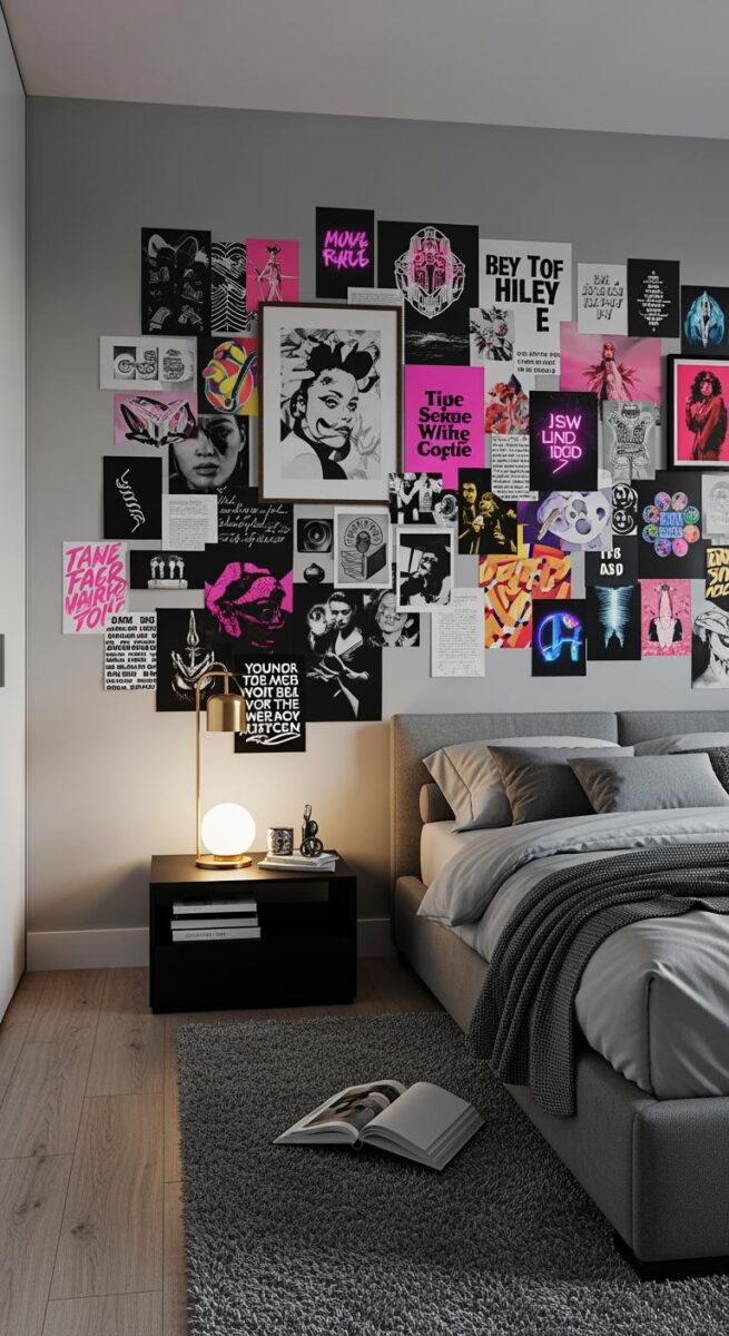 Fill a wall with magazine clippings, trendy TikTok art, or printed selfies.