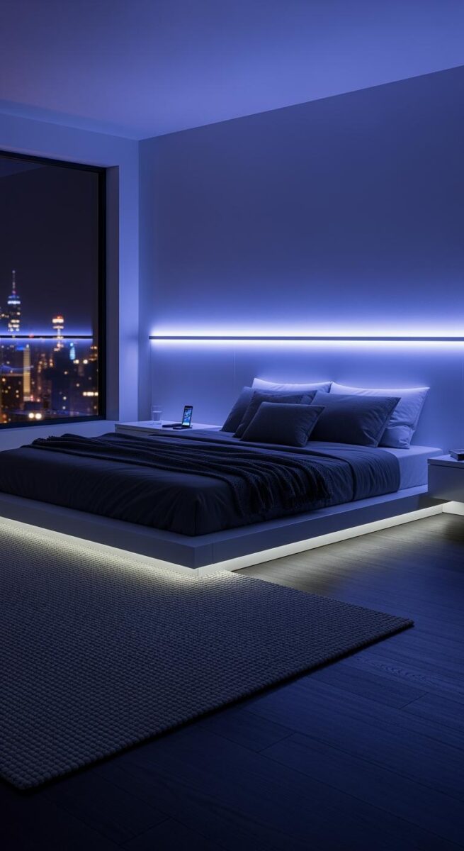 Install RGB LED strip lights along your ceiling edges, behind your headboard, or under your bed frame for that TikTok-worthy glow.