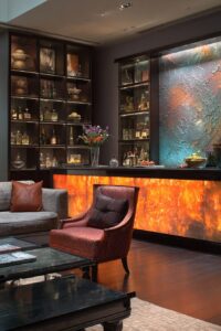 LED strip lights under the shelves create ambient lighting, while a statement pendant light or small chandelier adds drama.