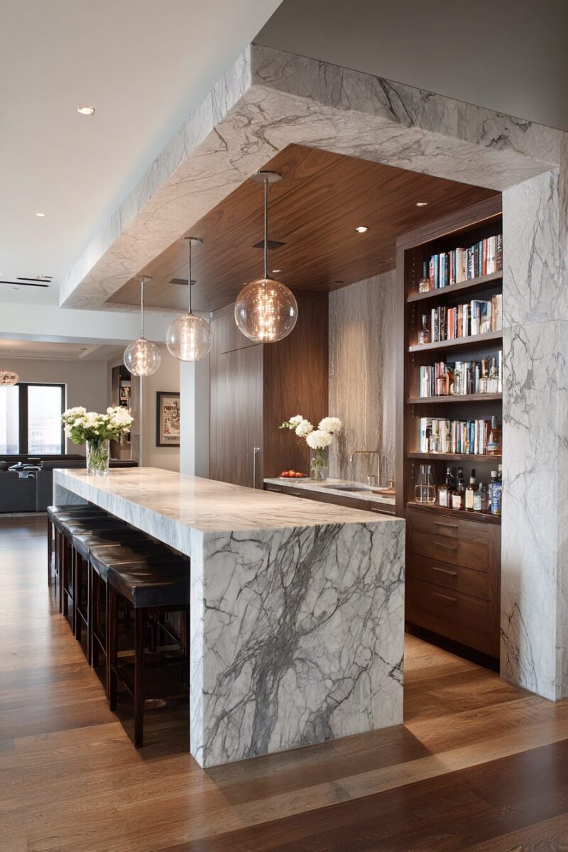 The book selection becomes part of the design – choose titles that reflect your personality or create themes like cocktail recipe books, novels about drinking culture, or classic literature that matches your home’s aesthetic.