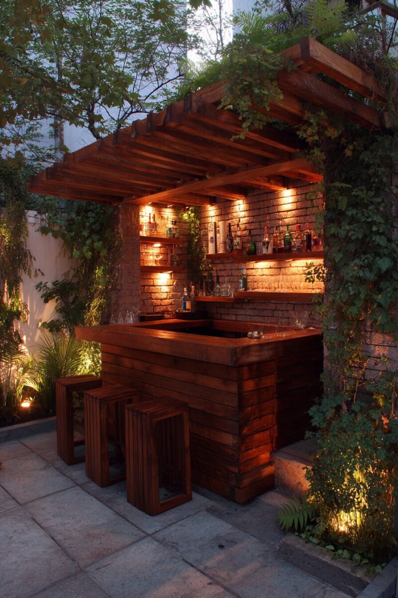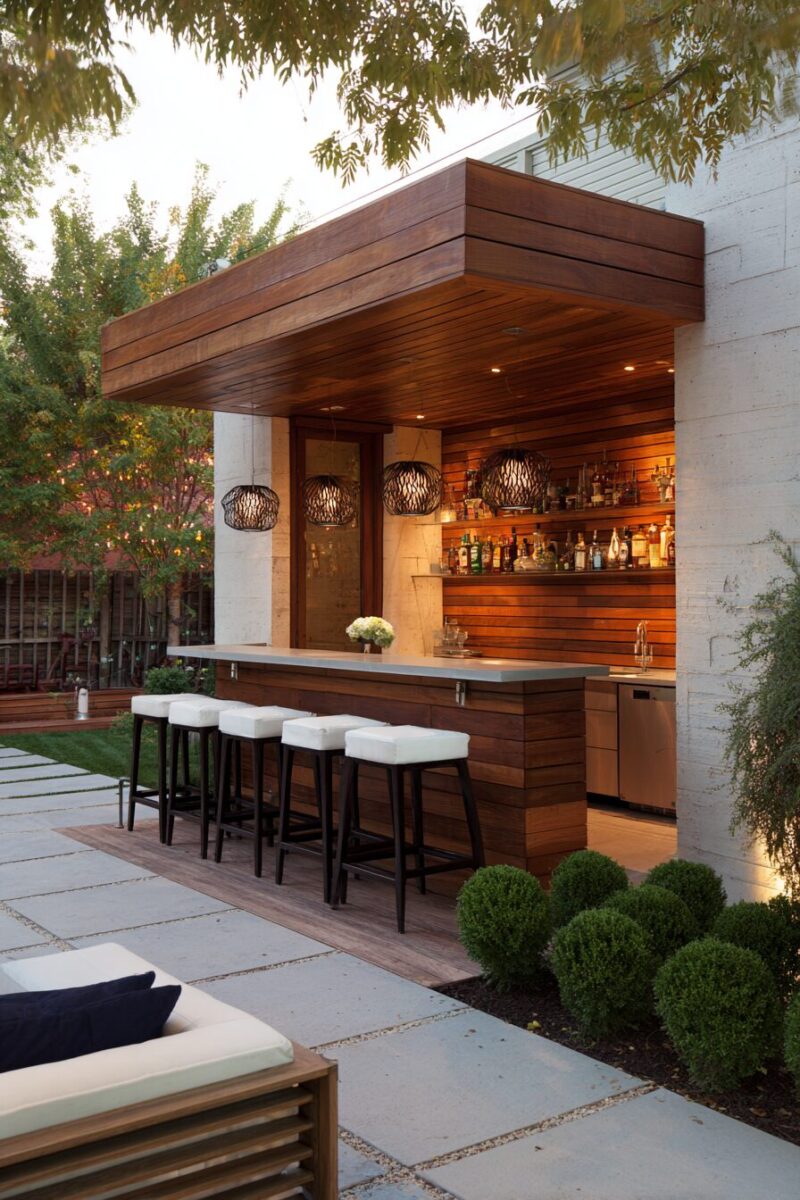 The bar itself can be built from weather-resistant materials like teak, cedar, or even outdoor-rated concrete for a modern industrial look.
