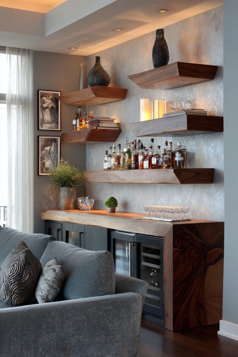 Floating bar shelves offer sophistication and functionality while maintaining the clean lines that make modern interiors so appealing.