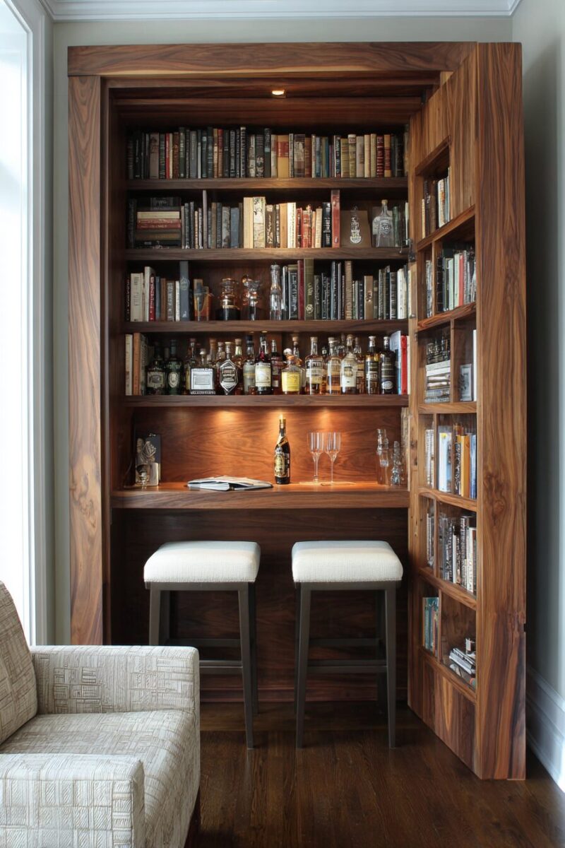 The mechanical aspects require some planning – hinges, magnetic locks, or sliding mechanisms need to be strong enough to support books while operating smoothly when you want to reveal the bar.