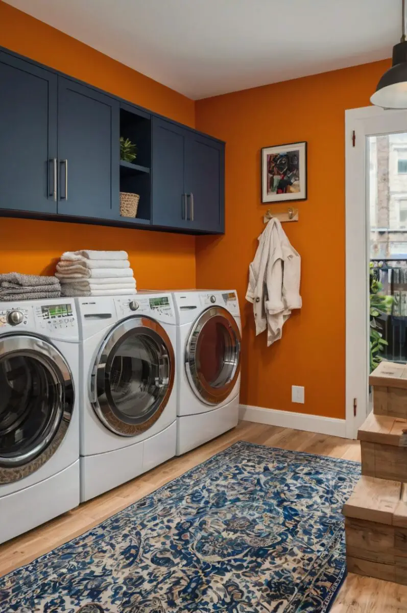 You’ll create maximum impact by choosing the wall behind your washer and dryer as your color focal point, which naturally draws attention to your primary work area while creating a stunning backdrop.