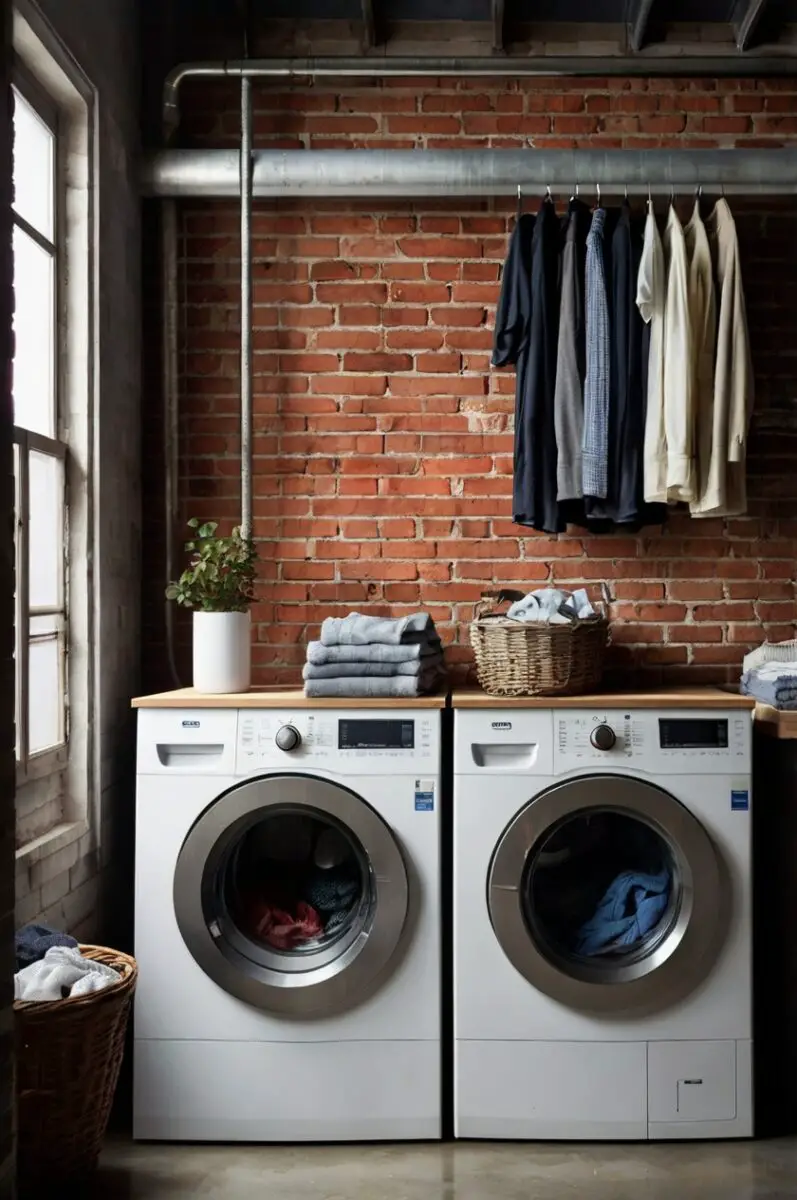 The key to nailing this look lies in balancing raw materials with modern conveniences – think exposed ductwork painted matte black alongside a high-efficiency washer and dryer set.