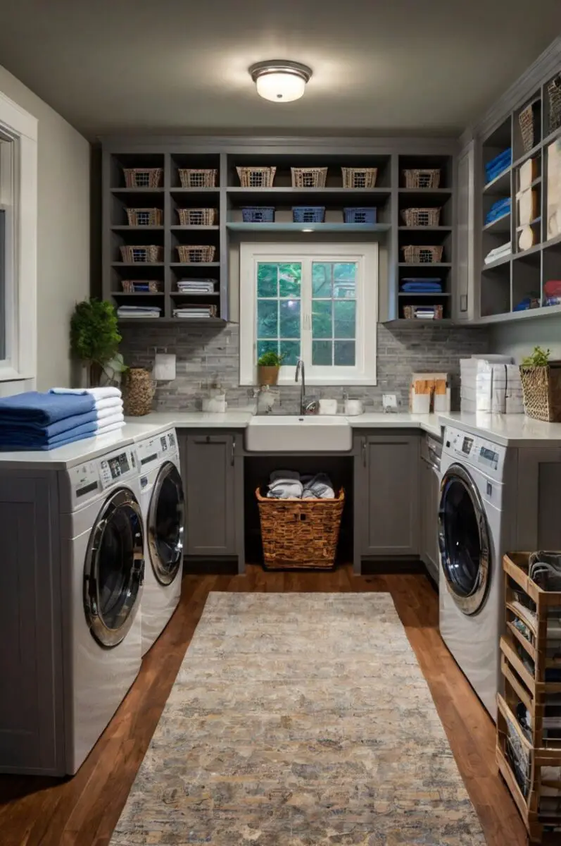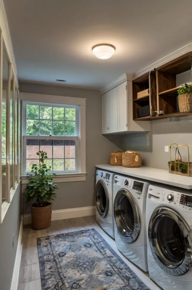 You can finish the look with a vintage-style area rug in muted tones that defines the workspace while adding comfort underfoot during those longer laundry sessions.