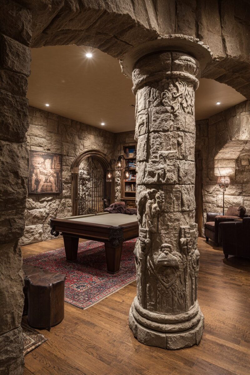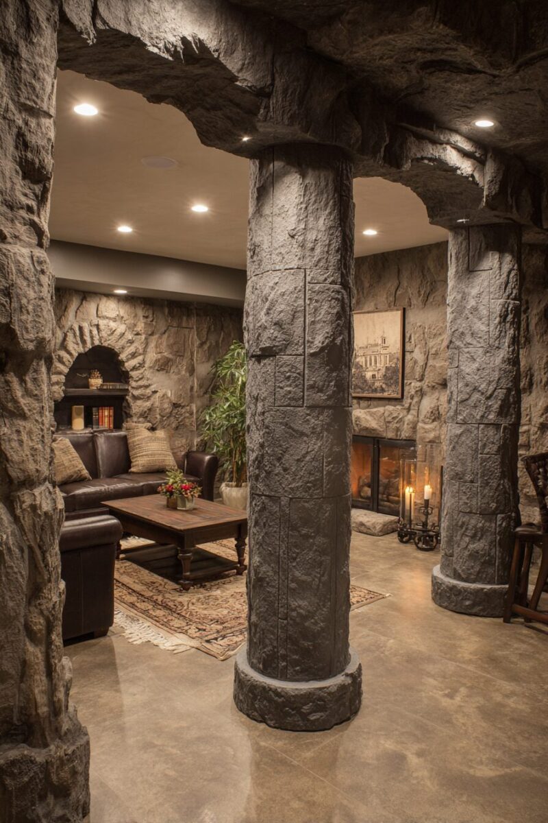 You can create the illusion of ancient castle pillars by wrapping your basement poles in faux stone panels.