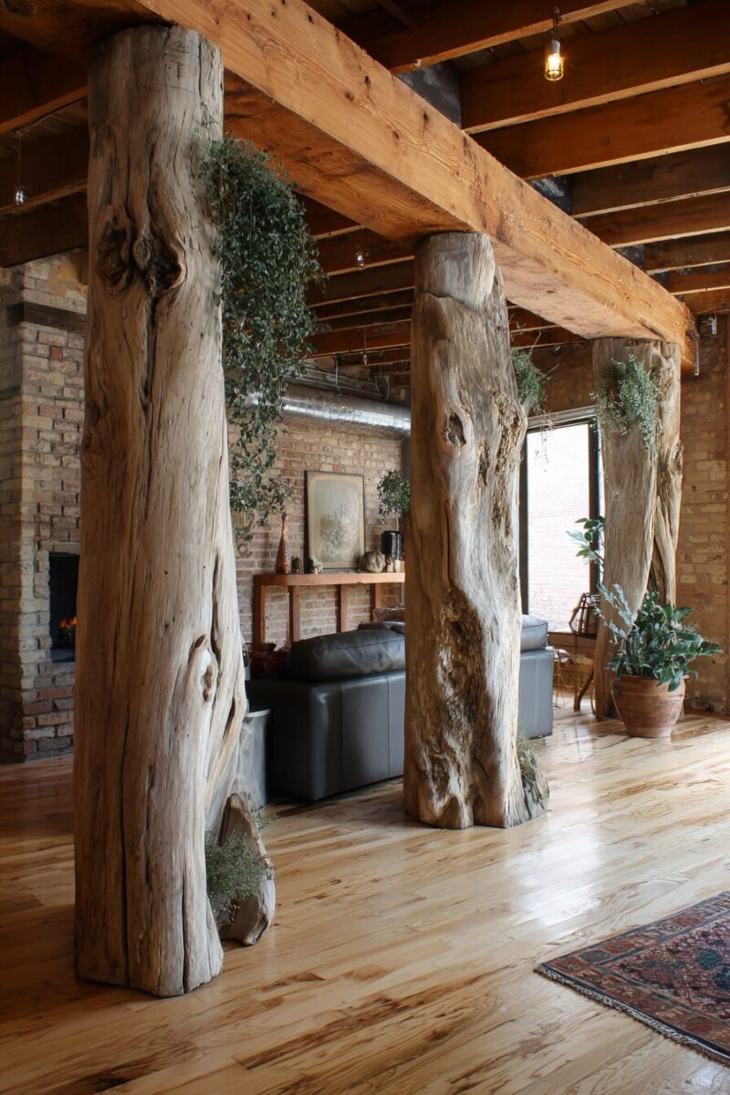 Create an enchanting indoor forest by transforming your basement poles into realistic tree trunks using specialized bark-textured materials.