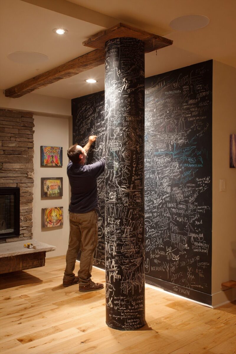 These chalkboard poles become interactive elements where family members can leave messages, create artwork, or track basement activities.
