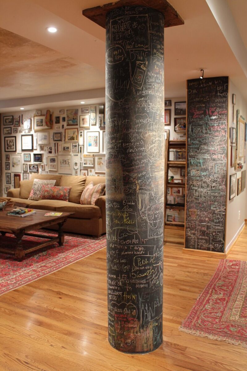 Turn your basement poles into functional art pieces by covering them with chalkboard paint that invites creativity and interaction.