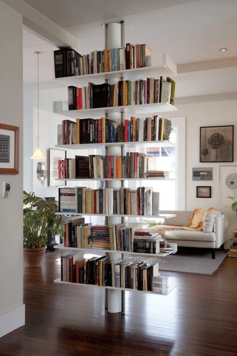 Create functional storage solutions by building custom bookshelf systems that incorporate your basement poles as central support elements for floor-to-ceiling storage.