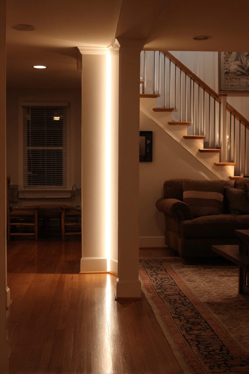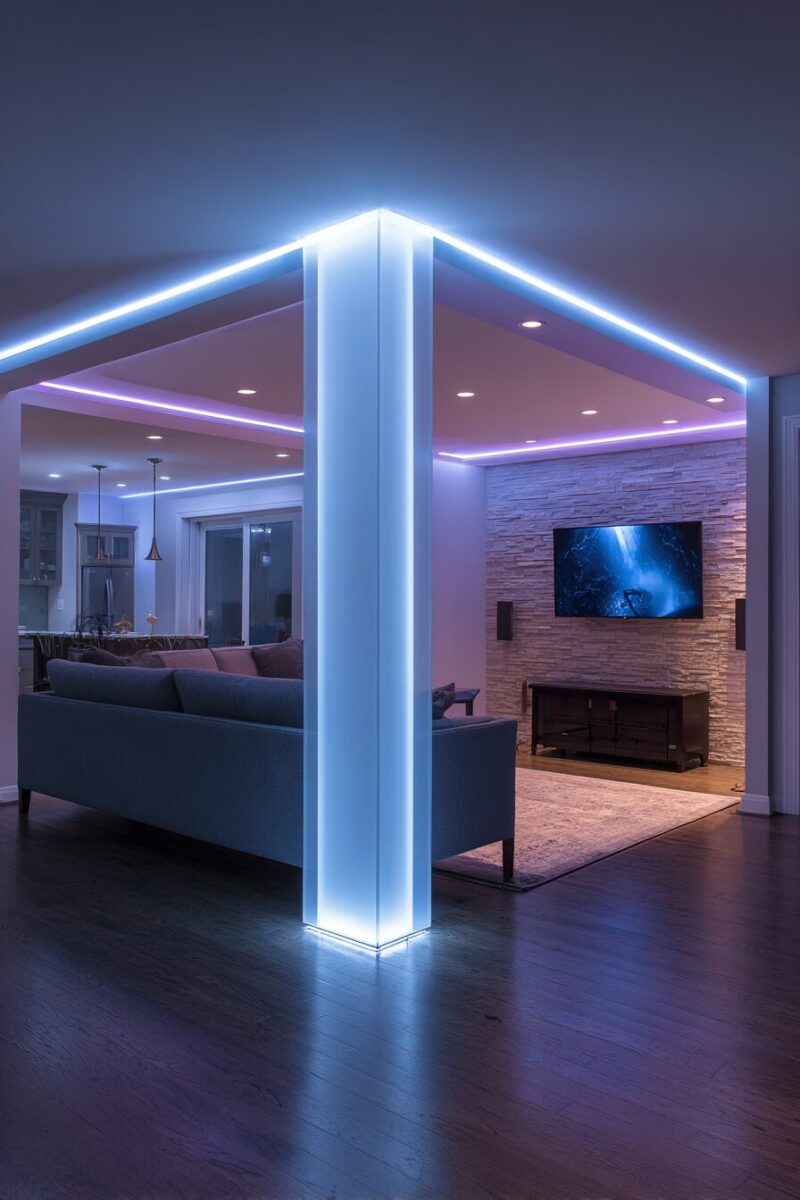 Create stunning ambient lighting effects by wrapping your basement poles with programmable LED strip lights that can change colors and patterns.