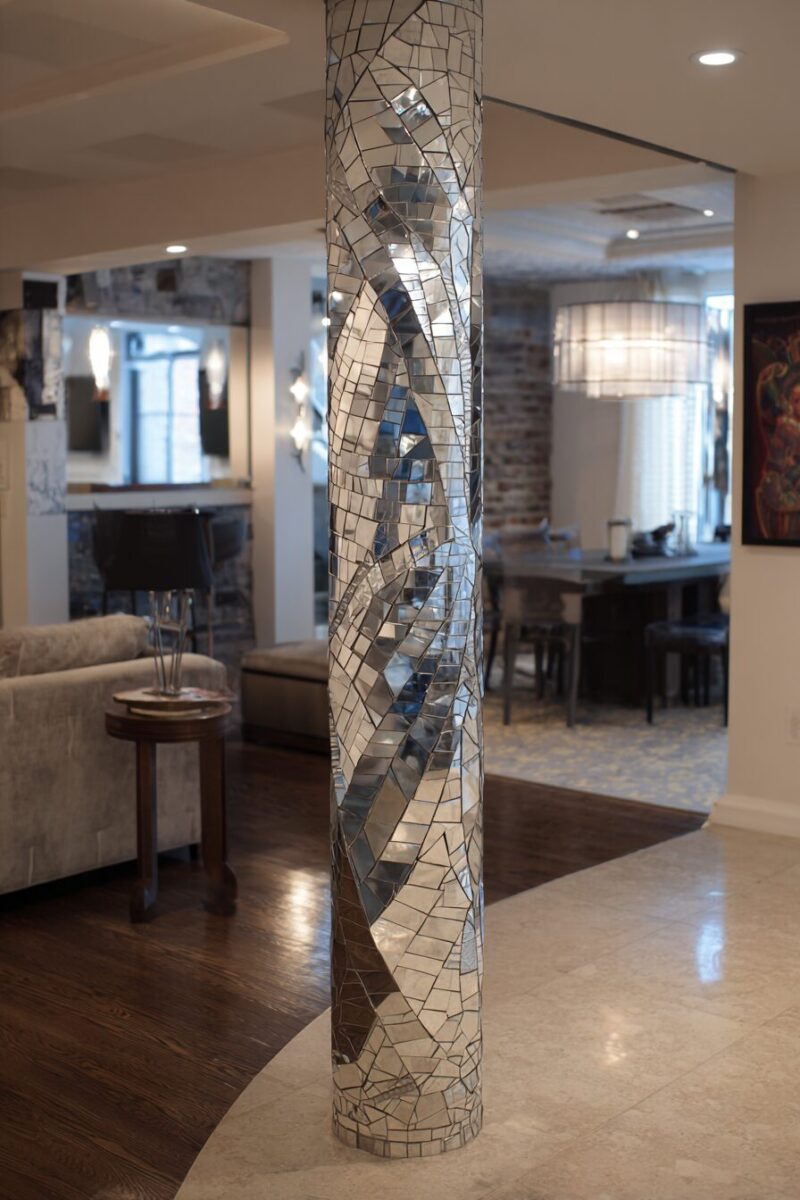 Transform your basement poles into sparkling focal points by covering them with small mirror tiles that create stunning light reflection patterns.