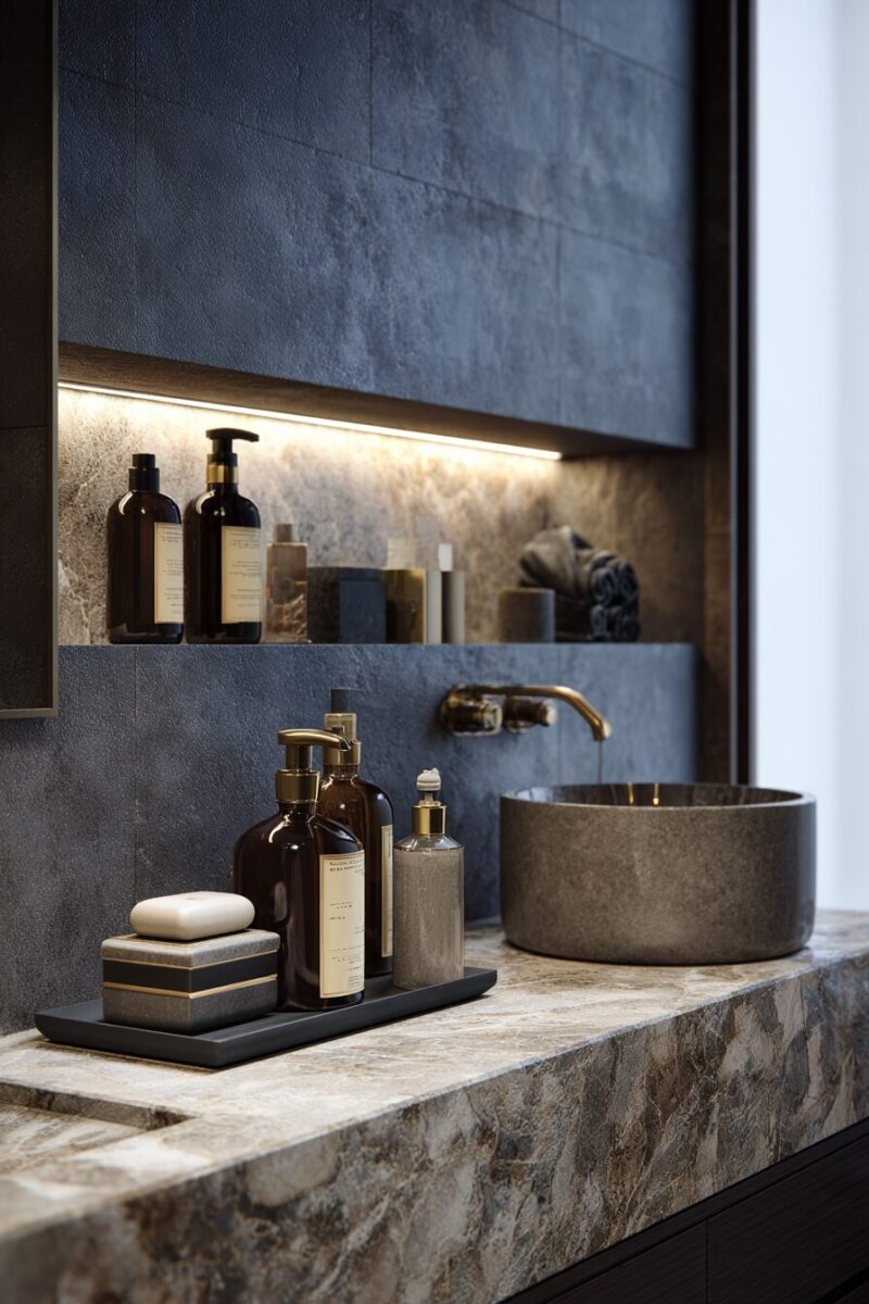 Professional tip: install LED strip lighting underneath each shelf to create a soft glow that makes your displayed items look even more luxurious while providing practical task lighting for your daily routines.