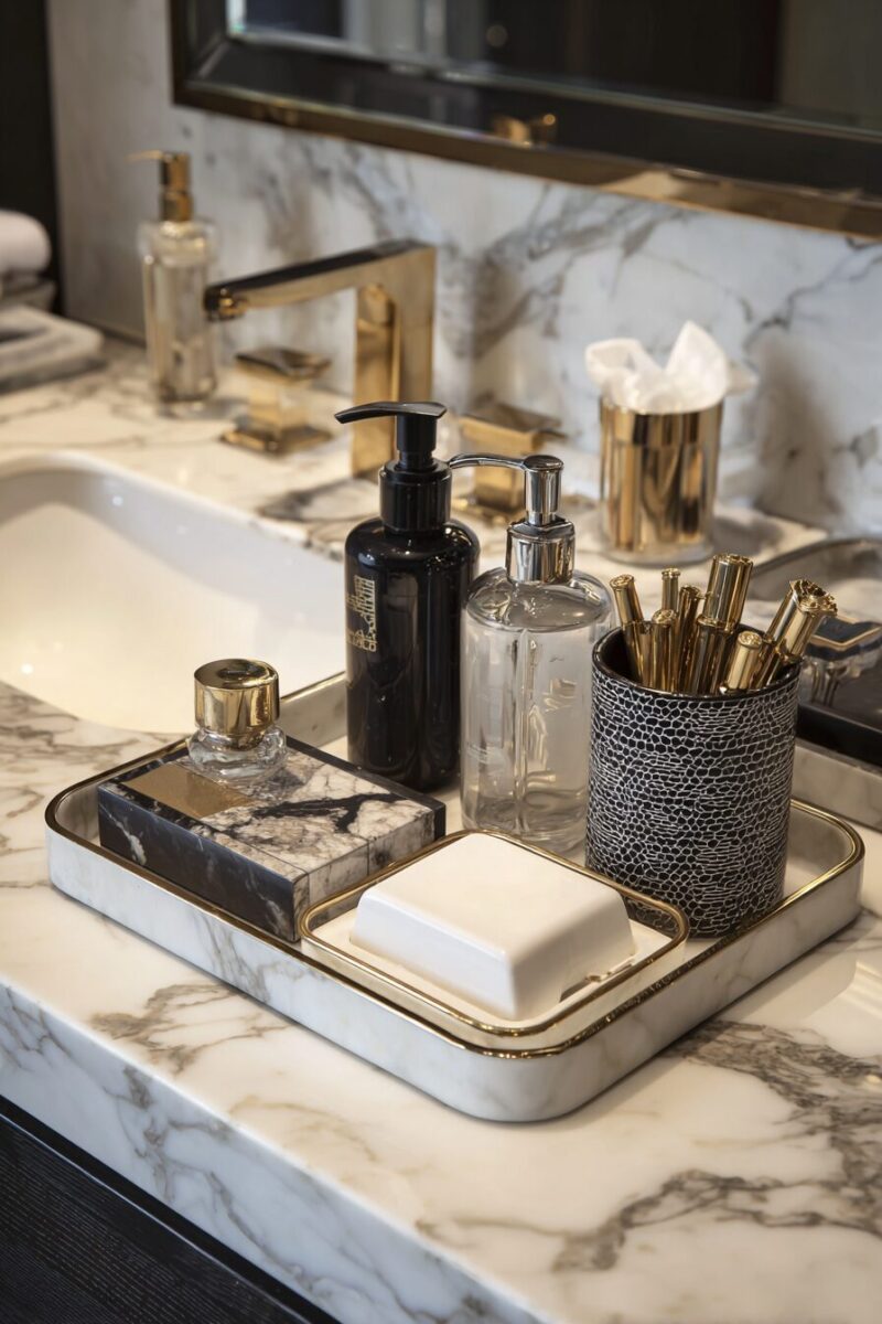A single marble tray transforms your bathroom counter from chaotic to curated, creating a designated space where your daily essentials look like they belong in a high-end boutique hotel.