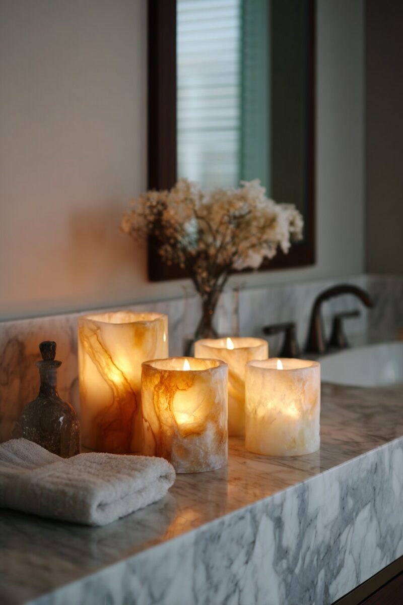 Strategic candle placement around your bathroom counter creates multiple levels of warm lighting that’s far more flattering and relaxing than harsh overhead fixtures alone.
