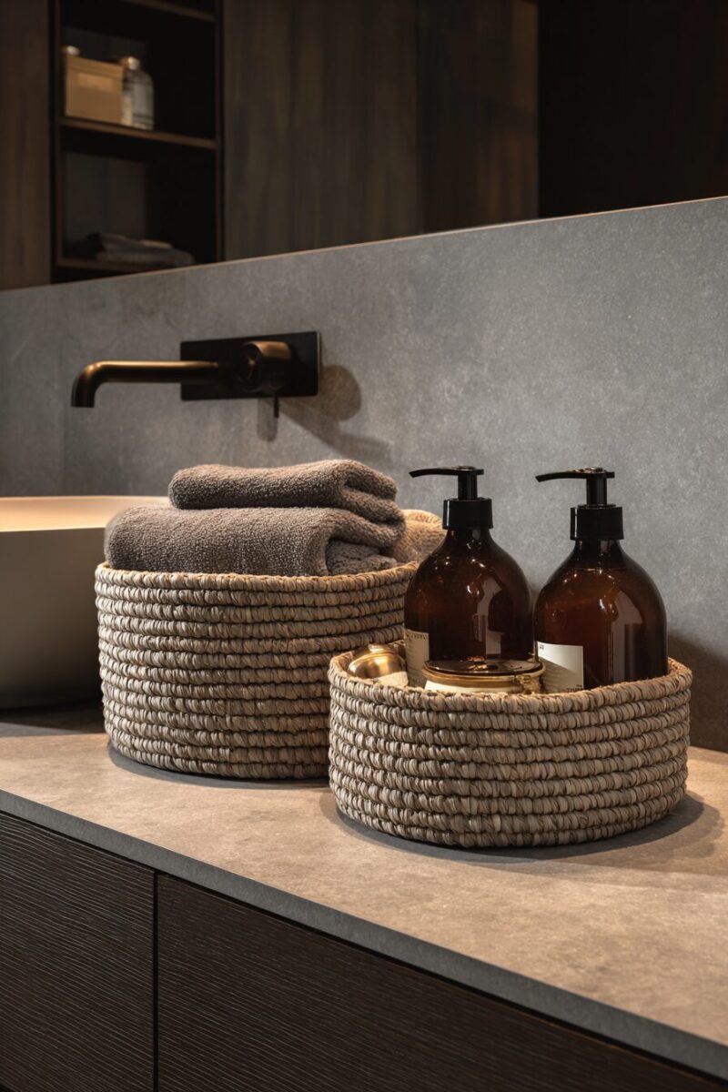 The key to making baskets look intentional rather than like storage afterthoughts lies in choosing pieces with consistent materials or colors that coordinate with your overall bathroom design.