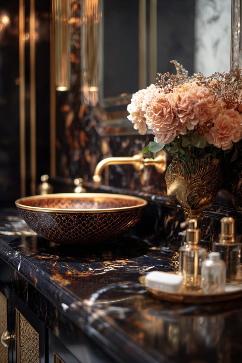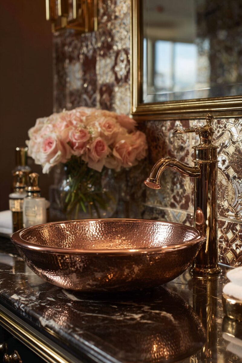 Introducing metallic elements to your bathroom counter instantly elevates the space from basic to breathtaking, creating reflective surfaces that catch and bounce light throughout the room.