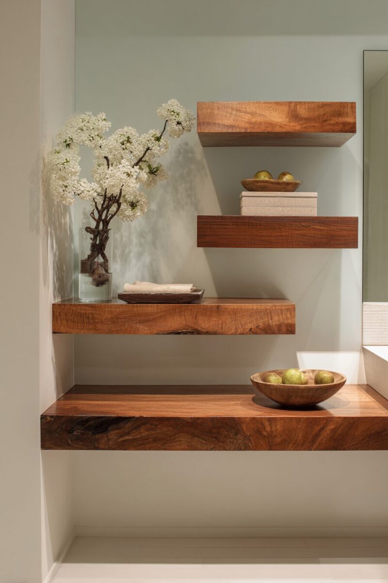 Floating shelves instantly elevate your counter space by drawing the eye upward and creating layers of visual interest that make even the smallest bathroom feel more spacious.