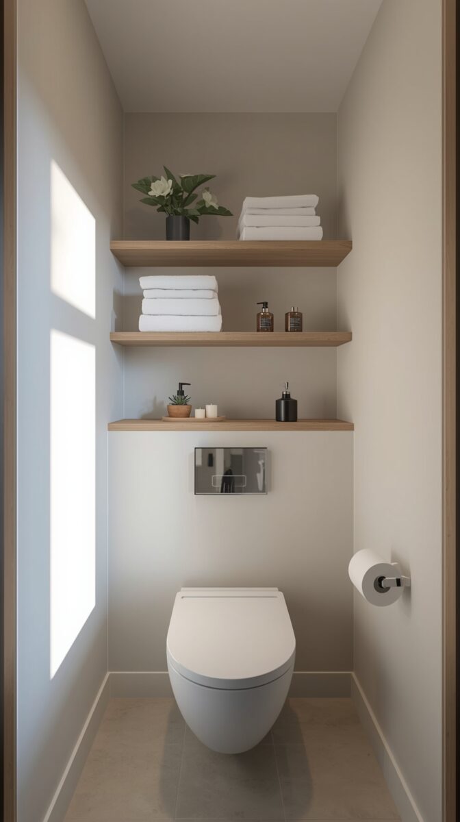 I installed two slim floating shelves behind my toilet last spring, and I’m obsessed.