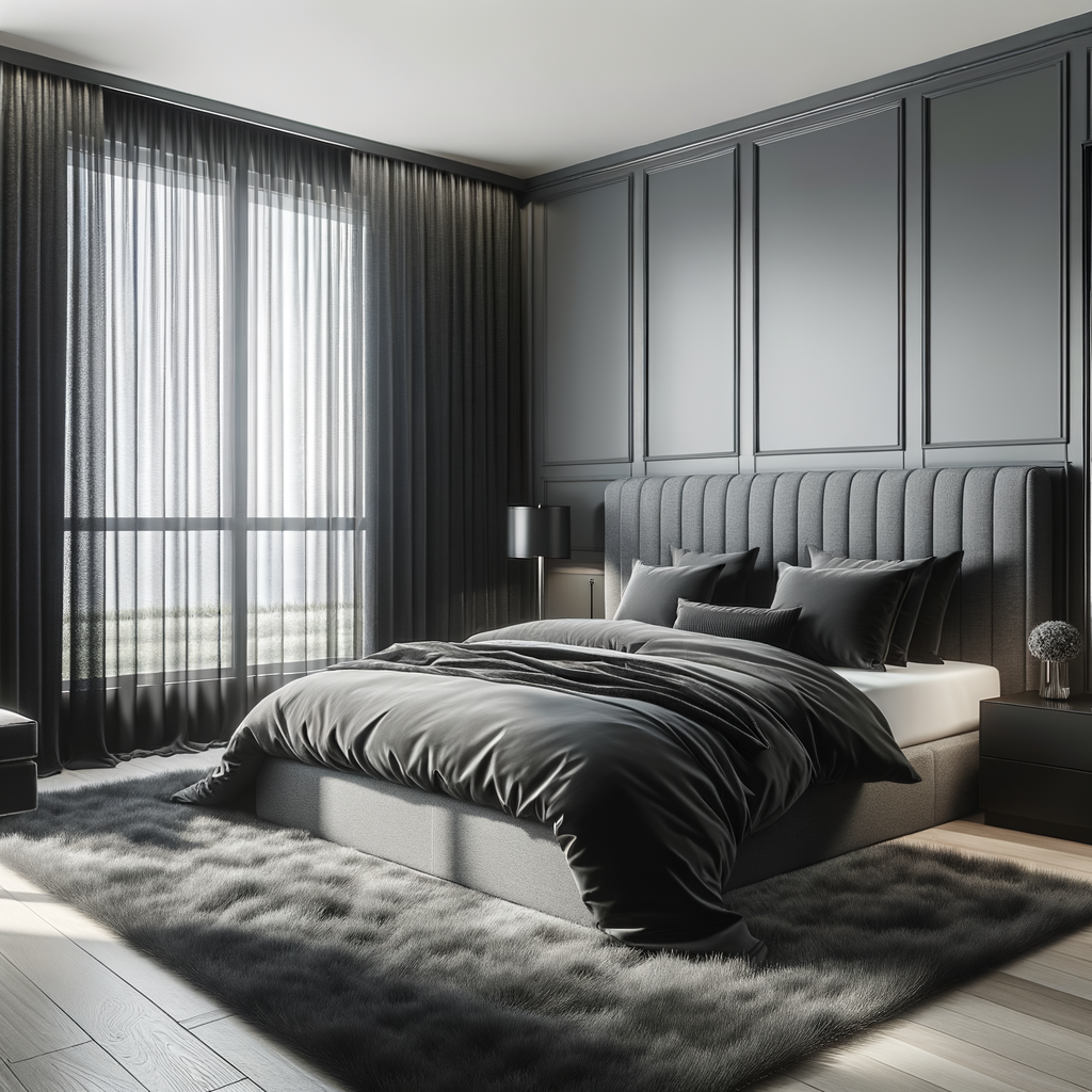 Use charcoal walls or headboard behind crisp white bedding for contrast and depth.