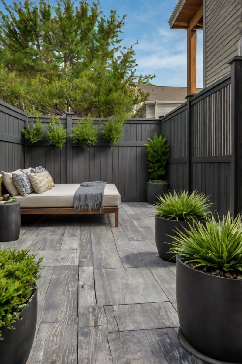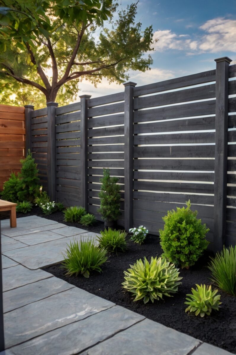 In smaller yards, painting just one accent fence section in charcoal can create a focal point without overwhelming the space.