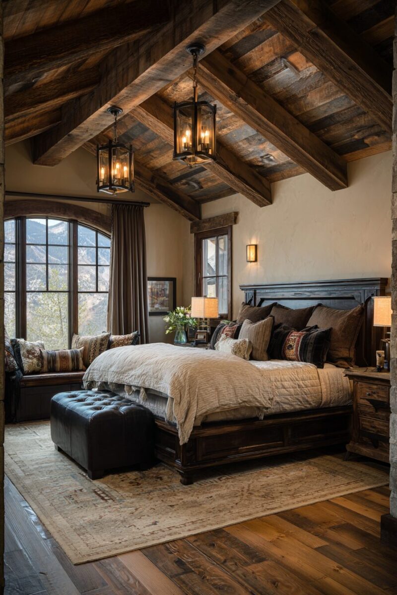 Exposed dark wood beams instantly transport you to an authentic western lodge, creating architectural interest that makes your bedroom feel like a custom-designed retreat.