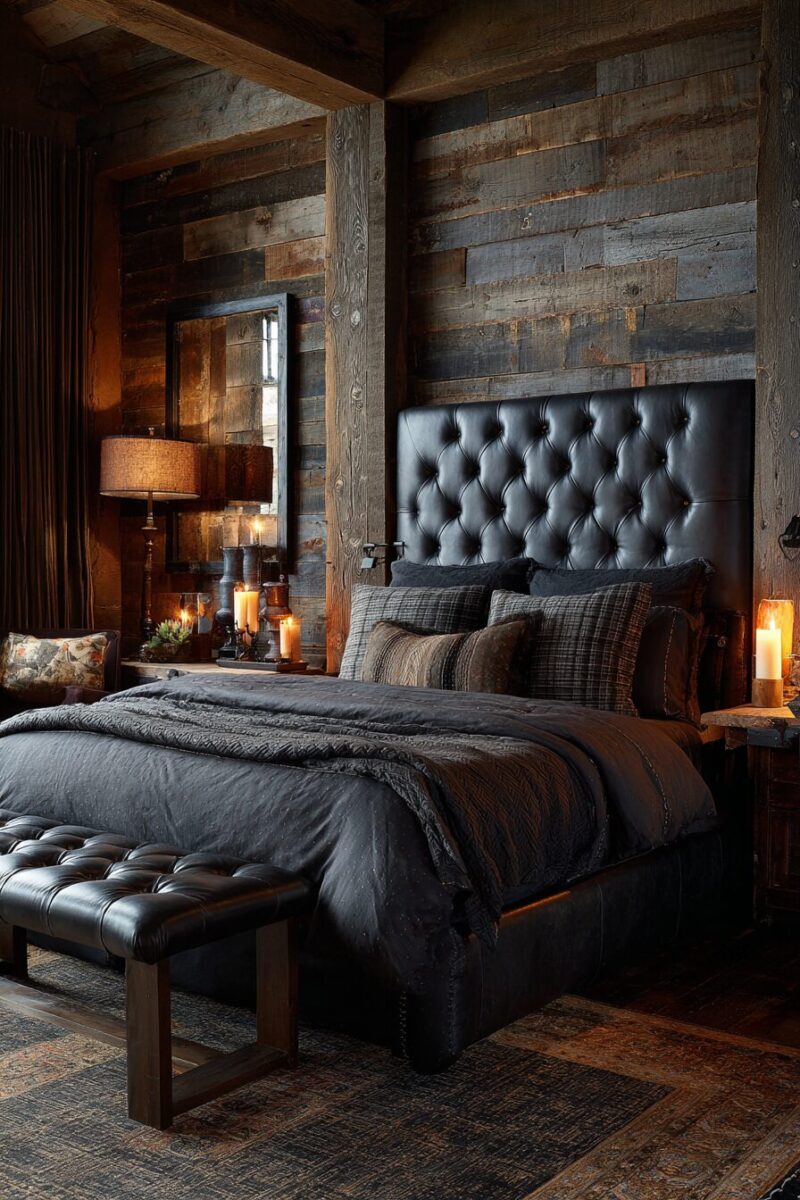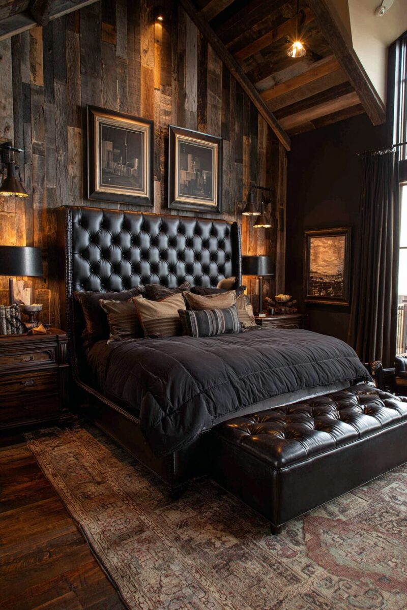 Picture walking into your bedroom and being greeted by a dramatic black leather accent wall that stretches behind your headboard like a piece of living art.