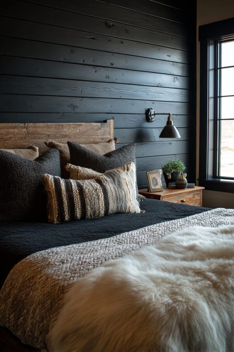 For smaller bedrooms, consider using black shiplap on just the upper portion of walls, paired with lighter wainscoting below to maintain an open feeling.