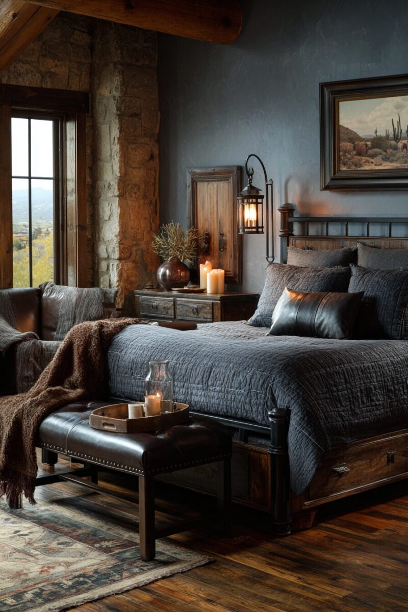 This combination works particularly well with wrought iron bed frames and vintage western accessories like old spurs, horseshoes, or antique lanterns displayed on floating barn wood shelves.