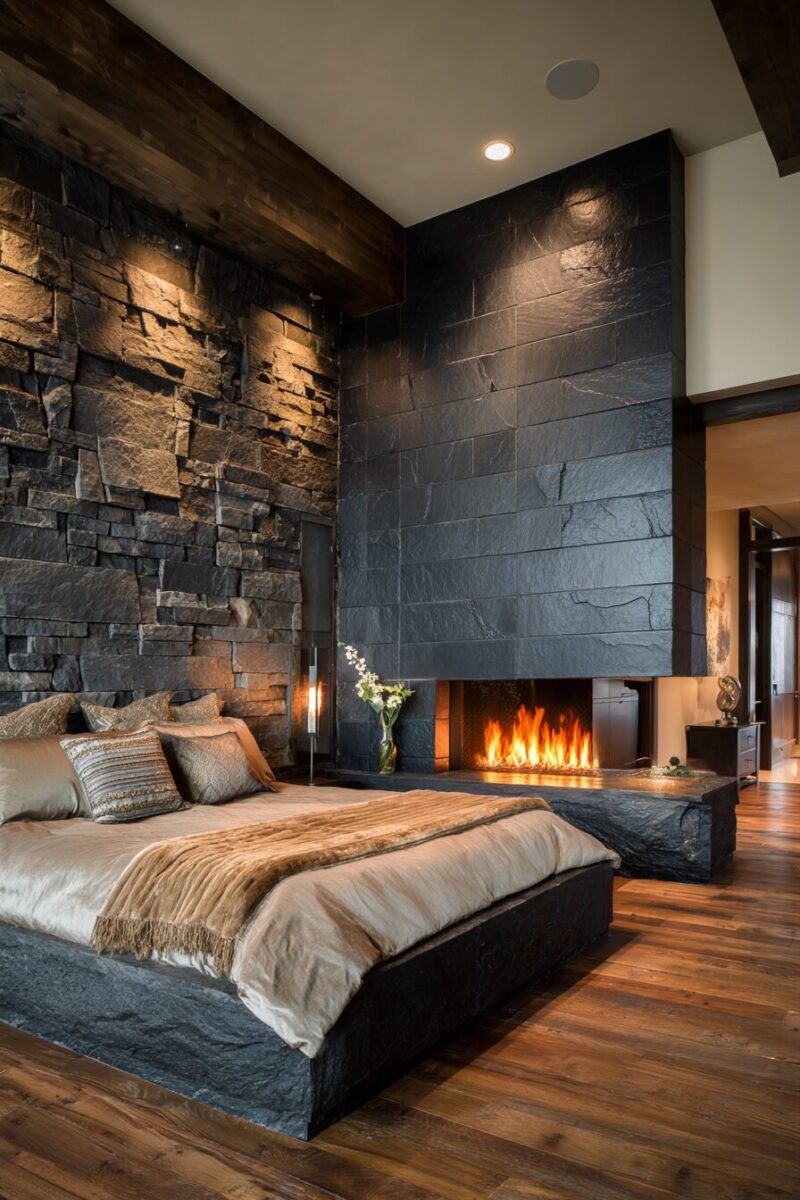 A floor-to-ceiling stone wall behind your fireplace creates architectural drama that makes your bedroom feel like a high-end lodge or boutique hotel.