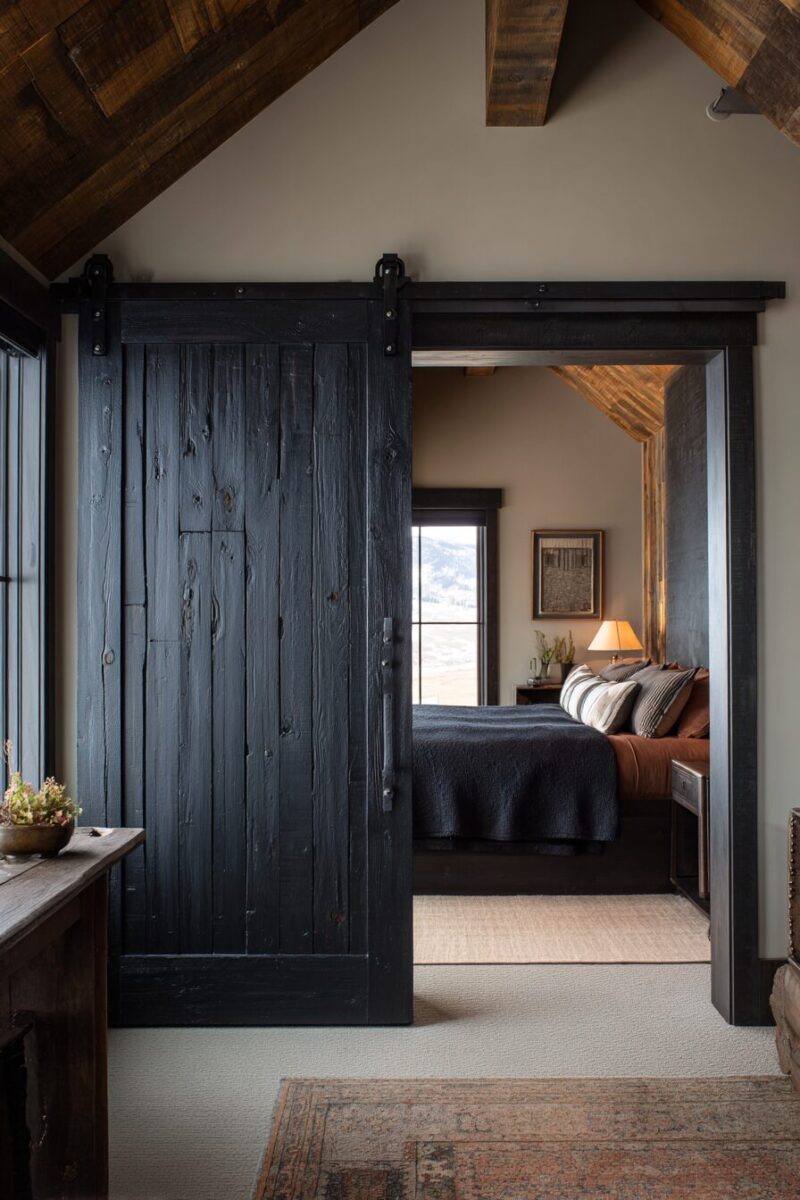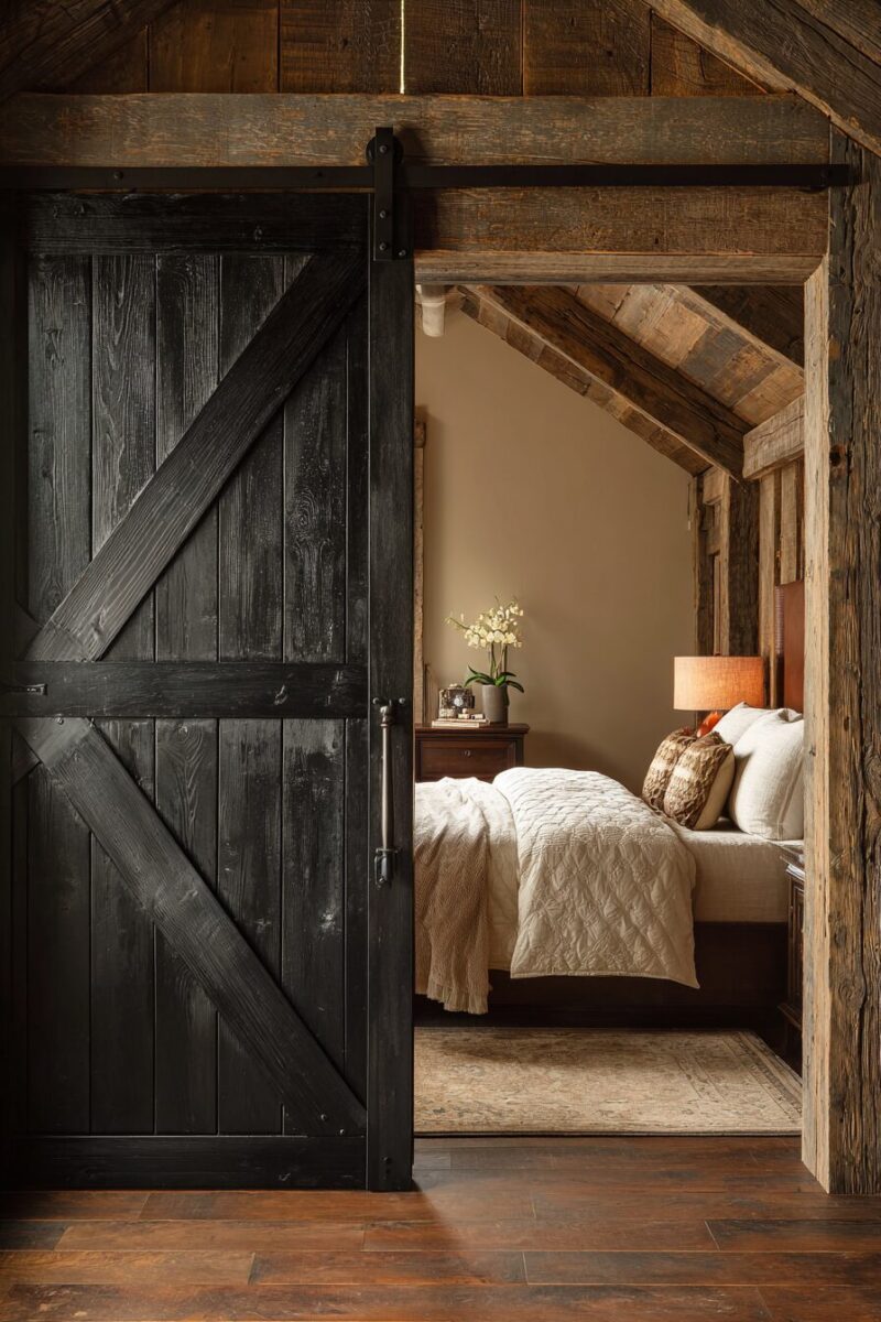 Black barn doors also work beautifully as headboard alternatives, mounted to slide horizontally behind your bed to create an ever-changing backdrop.