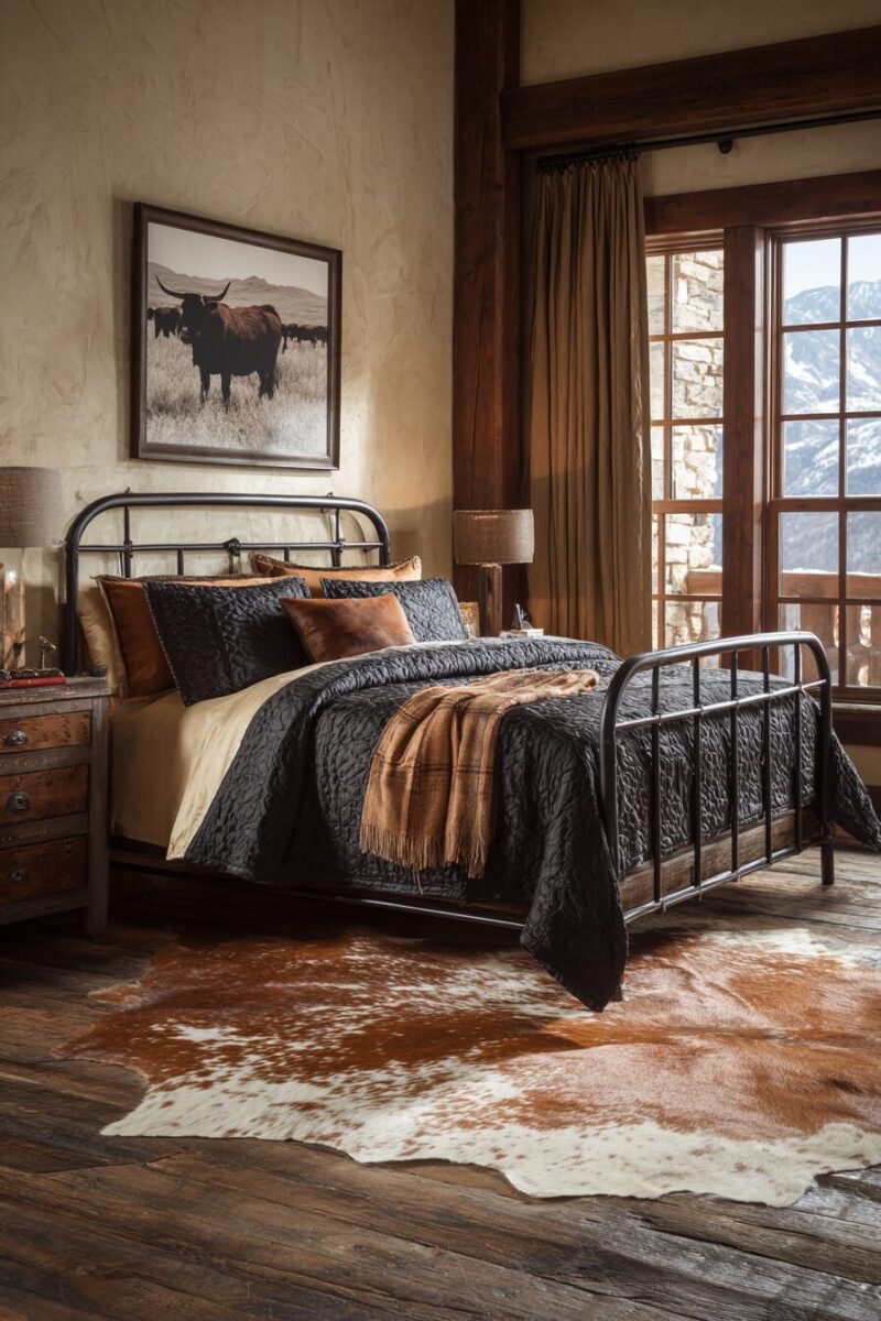 The organic, irregular shape of cowhide rugs breaks up the clean lines of the iron bed frame, creating visual interest and preventing the room from feeling too structured or rigid.